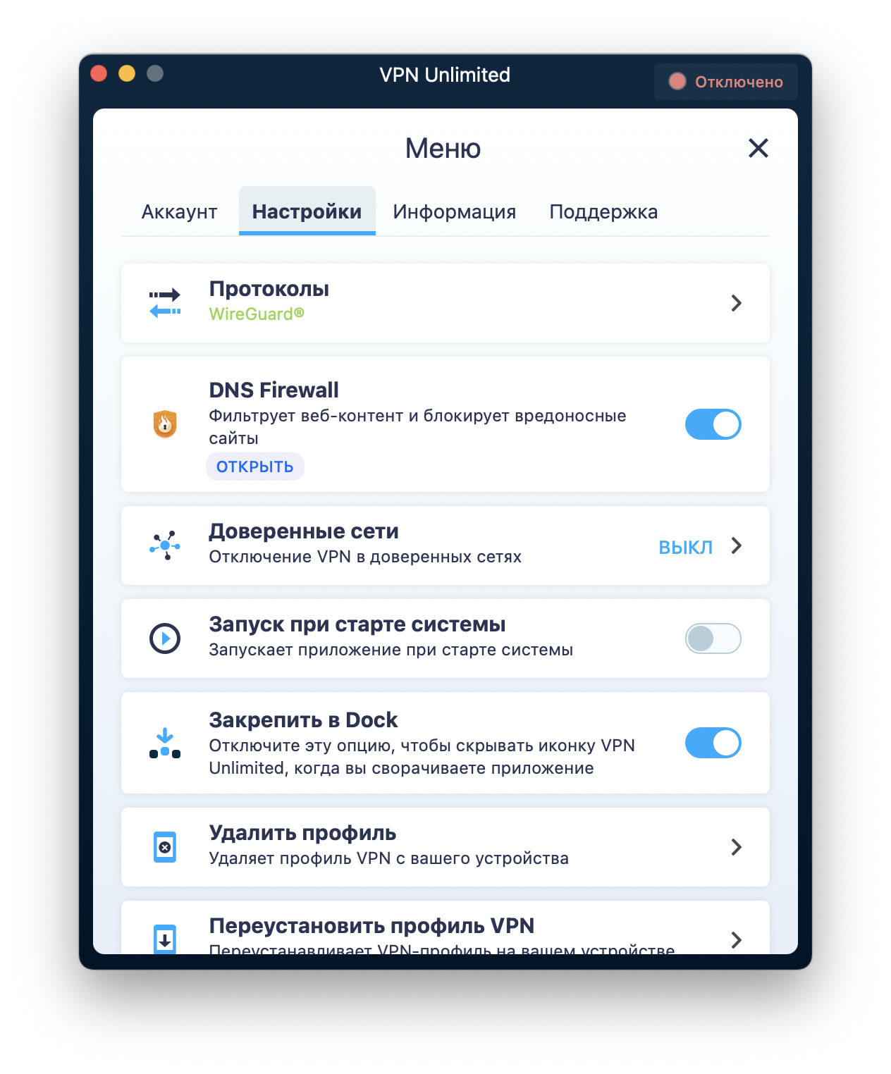 Примечание: DNS Firewall, который ранее был встроенной функцией VPN Unlimited, теперь доступен как отдельный продукт. Он блокирует вредоносные веб-сайты и обеспечивает дополнительную защиту ваших данных в сети. Узнайте больше на этом сайте.